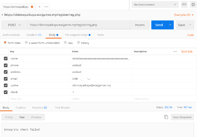 final String checks = md5(name + phone + address + email + "skimcepatkaya@wargames.my");