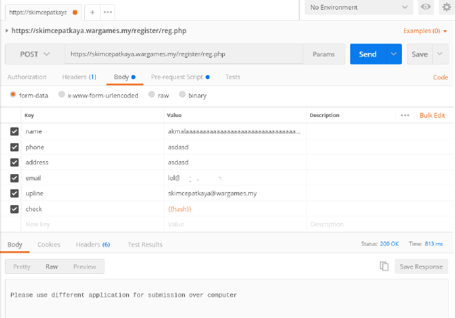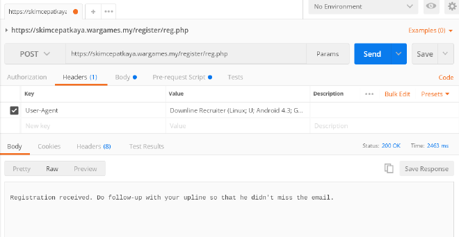 Hmm, ‘follow up with you upline so that he didn’t missed the email’. That means the server is sending email to the upline! Lets change the upline email to something within our control so we can see what the server sent. Initially I used my Gmail but never received anything, maybe blocked by Gmail. Then I send the email to my own server and able to receive it.
